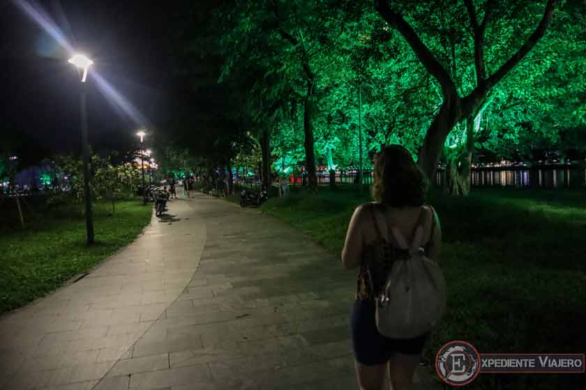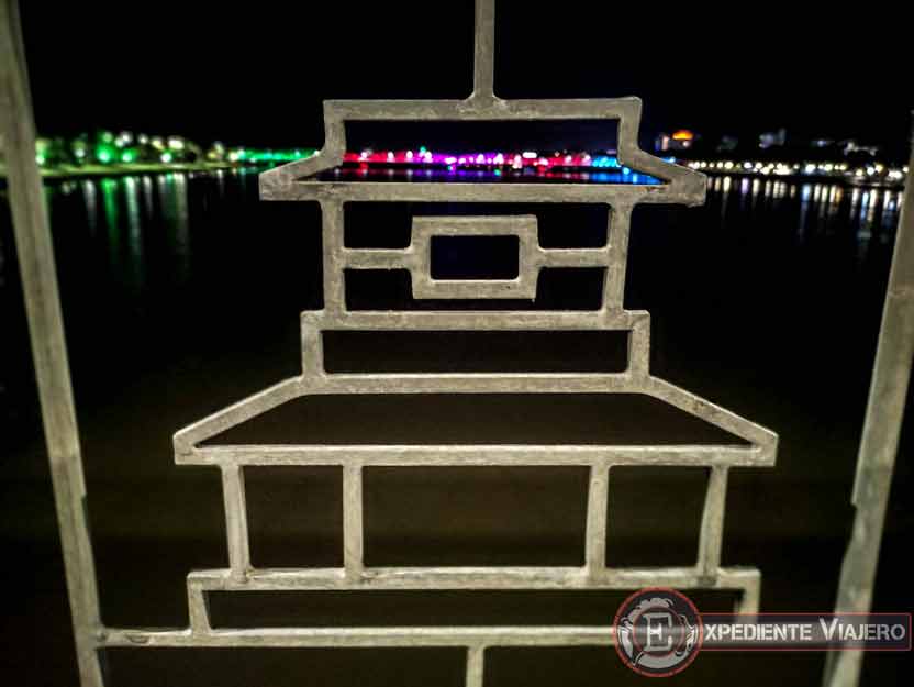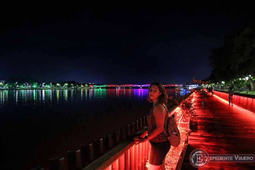 Cruzamos este puente para llegar al otro lado del río Perfume, donde nos encontramos con otro paseo junto al río, el Nguyen Dinh Chieu Walking Street, aunque en este caso, en vez de ser un parque normal y corriente, que también lo tiene, es un paseo con unas plataformas que también se iluminan con luces LED.