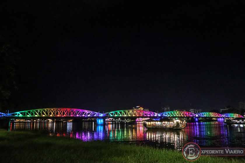 El puente Cầu Trường Tiền se ilumina por las noches con distintos colores, como tanto les gusta hacer a los vietnamitas y que nos recuerda mucho a nuestro viaje por China!
